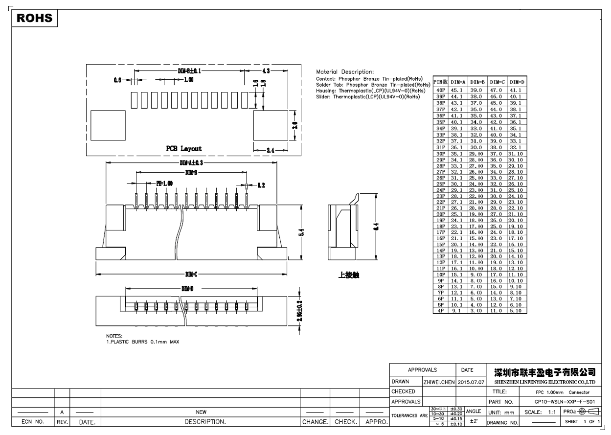 產(chǎn)品簡(jiǎn)介品名:FPC連接器規(guī)格:臥式貼片/90°間距:1.0mm/上接觸PIN數(shù):4P-40P高度:2.5mm