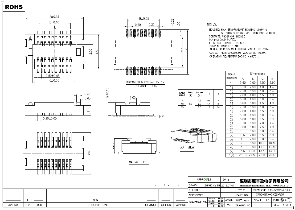產品簡介品名:0.5mm單槽板對板連接器母座型號:LFY02-5xx-GxxS-WOR規格:0.5mm間距/立式180°PIN數:10-100PIN塑膠顏色:米黃色