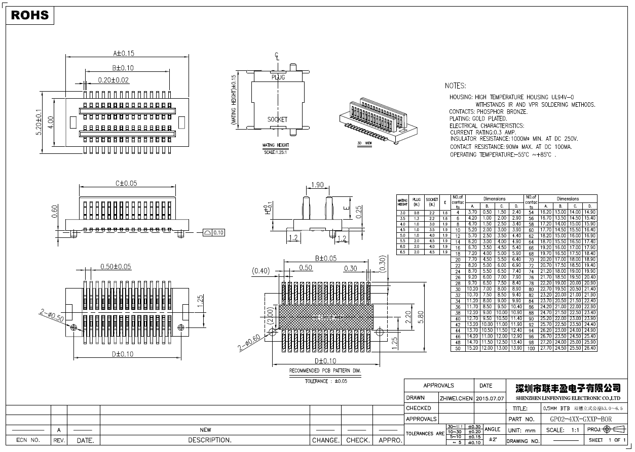 產品簡介品名:0.5mm雙槽板對板連接器公座型號:LFY02-4xx-GxxP-BOR規格:0.5mm間距/立式180°PIN數:4-100PIN塑膠顏色:黑色