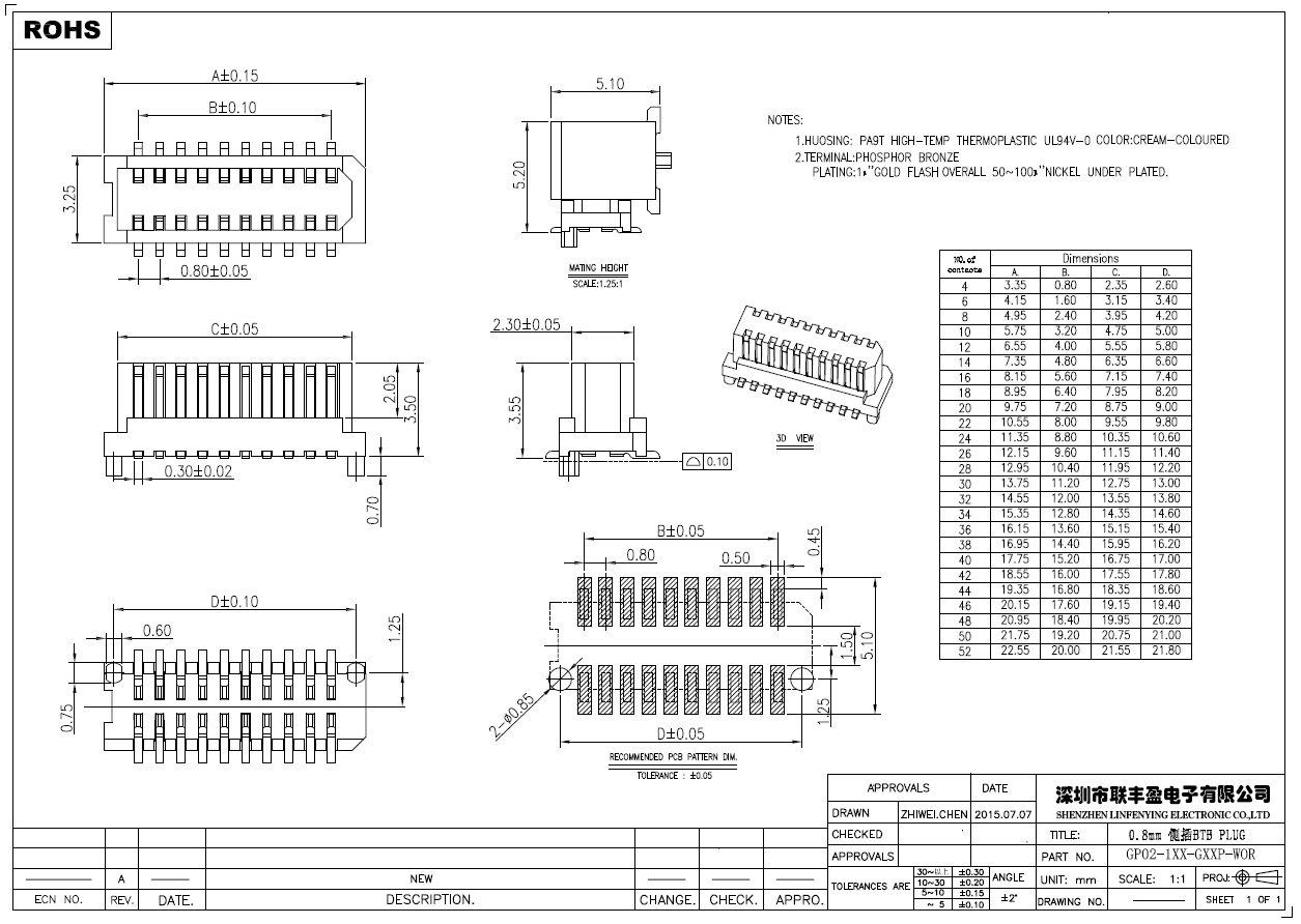 產品簡介品名:0.8mm側插板對板連接器公座型號:LFY02-100-GXXP-WOR規格:0.8mm間距/臥式90°PIN數:4-52PIN塑膠顏色:米黃色