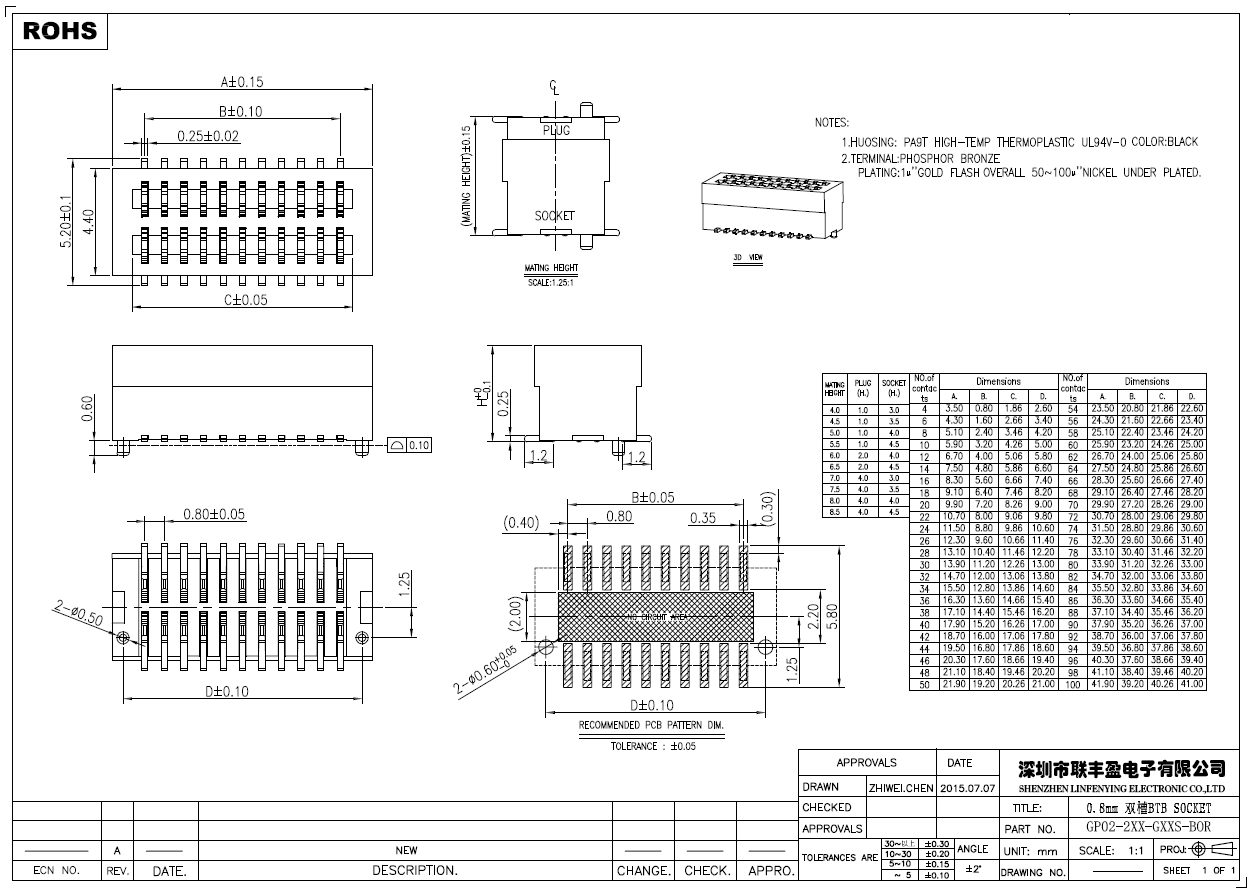 產品簡介品名:0.8mm雙槽板對板連接器母座型號:LFY02-2XX-GxxS-BOR規格:0.8mm間距/立式180°PIN數:4-52PIN塑膠顏色:黑色