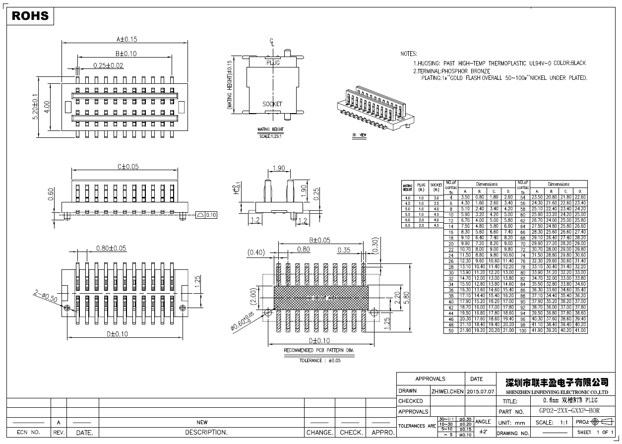 產品簡介品名:0.8mm雙槽板對板連接器公座型號:LFY02-2XX-GxxP-BOR規格:0.8mm間距/立式180°PIN數:4-100PIN塑膠顏色:黑色