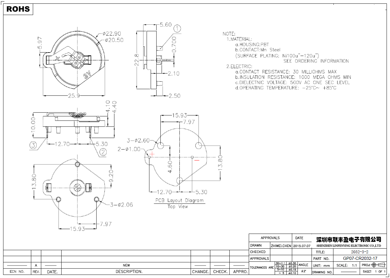 產品簡介品名:電池座產品型號:LFY07-CR2032-17電池型號:CR2032產品規格:DIP/插件式備注:黑色