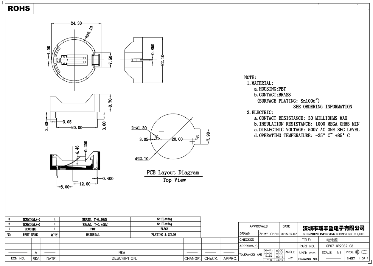 產品簡介品名:電池座產品型號:LFY07-CR2032-08電池型號:CR2032產品規格:DIP/插件式備注:黑色