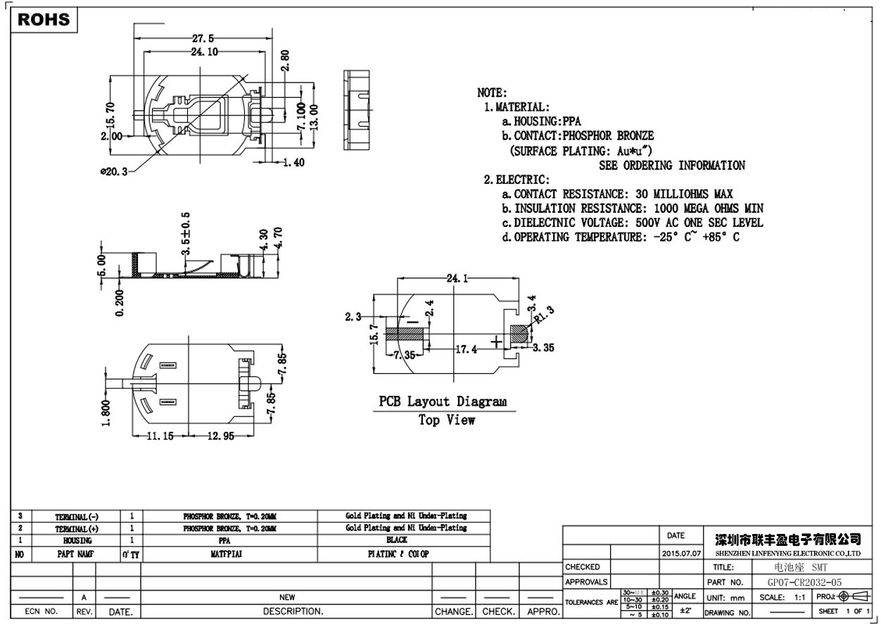 產品簡介品名:電池座產品型號:LFY07-CR2032-05電池型號:CR2032產品規格:SMT/貼片式備注:黑色
