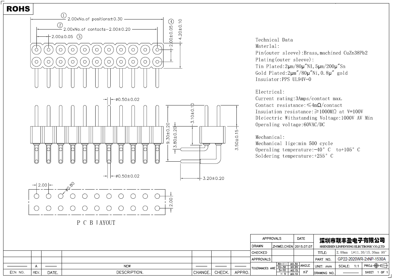 產品簡介品名:排針規格:插件/臥式90°間距:2.00mmPIN數:2P-40PIN備注:圓孔排針系列