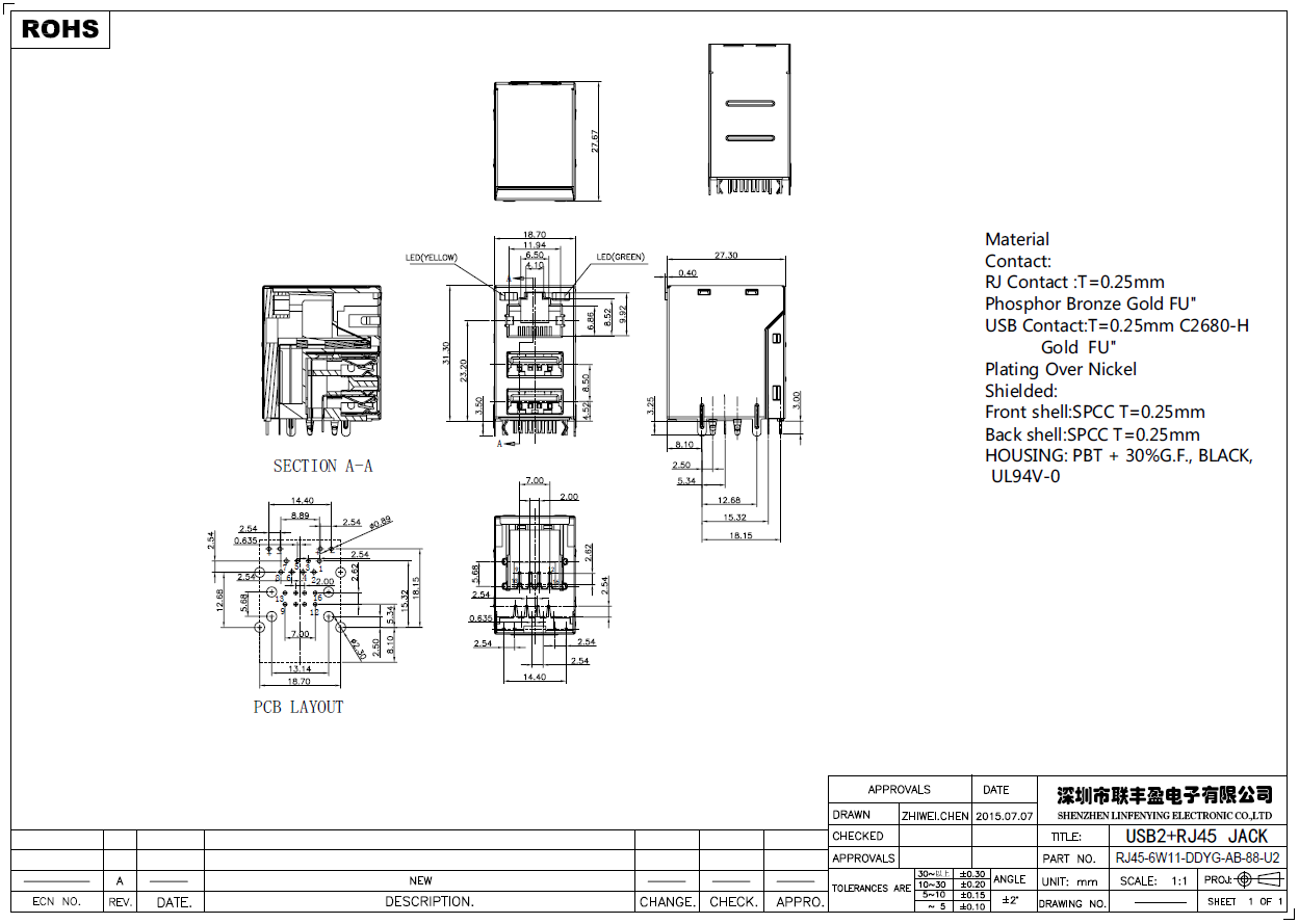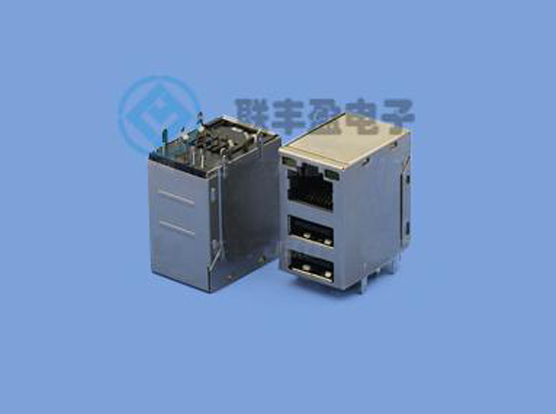 產品簡介品名:RJ45網絡連接器規格:臥式插件/90°外殼:帶屏蔽/帶USBLED燈:黃/綠-其它顏色可定制塑膠顏色:黑色