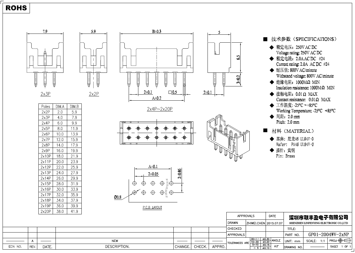 產品簡介品名:線對板連接器規格:直式/插件180°間距:2.00mmPIN數:4-36PIN