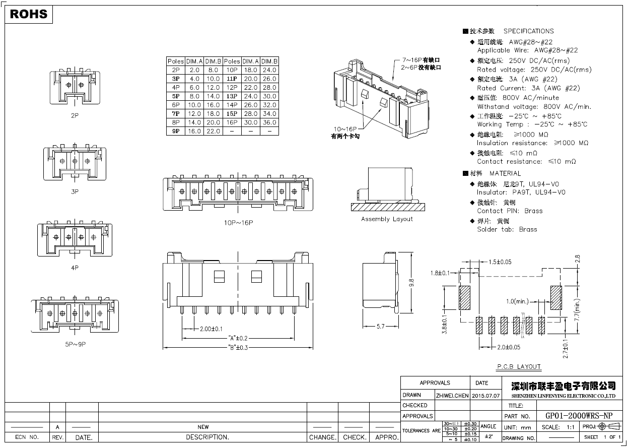 額定電流: 3A, AC/DC 額定電壓: 250V, AC/DC 使用溫度范圍: -25℃-+85℃ 接觸電阻: 10M max 絕緣電阻 : 1000M min 耐壓 : 800V AC/minute 產品應用: 應用于各類室內外LED智能照明燈條、TV背光模塊LED燈條、