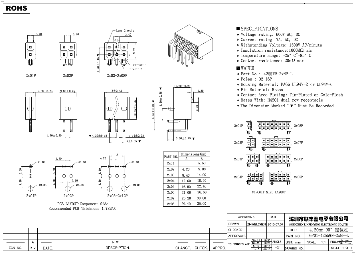產品簡介品名:線對板連接器規格:臥式帶柱/插件90°間距:4.20mmPIN數:2-16PIN